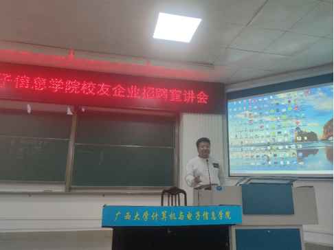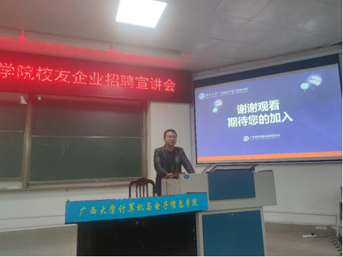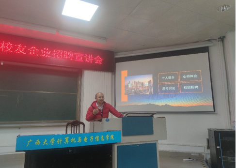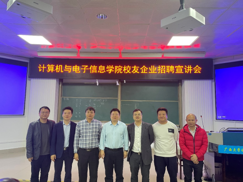 2021年12月16日下午,2138CC太阳集团与校友企业合作,在学院214报告厅召开校友企业招聘宣讲会,校友企业广西尚信品科技有限公司、广西迅驰信息科技有限公司、广西优乐俊智能机器人有限公司和广西码农信息科技有限公司、以及广西天海信息科技有限公司等5家企业到学院开展2022届毕业生招聘宣讲。