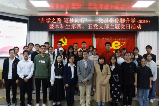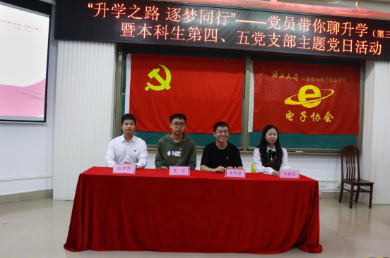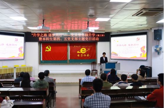 2022年11月26日晚上,由2138CC太阳集团本科生第四党支部主办,联合本科生第五党支部、学院团委电子创新协会共同承办的主题为“升学之路 逐梦同行”——党员带你聊升学(第三季)升学经验分享会在学院214报告厅举行。学院党委副书记邓珍琪老师,学院学生电子创新协会指导老师、电子信息工程系主任张学军教授,本科生第四党支部书记、学院团委副书记杨洋老师,本科生第五党支部书记、学院专职组织员薛金凤老师,学院专职辅导员庞承业老师出席会议。本次升学经验分享会由学院电子创新协会2021级本科生蔡其峰同学主持,通信工程191班朱硕隆同志、通信工程182班吴艳丽同志、网络工程192班姜岩同志、通信工程171班赵彦雪同志为本次分享会主讲人。