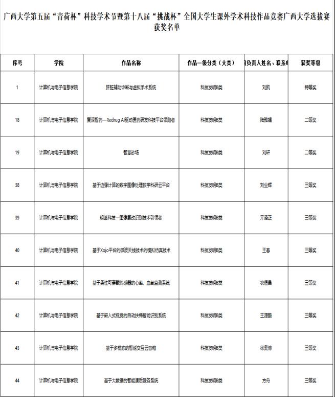 在刚刚结束的广西大学第五届“青荷杯”科技学术节暨第十八届“挑战杯”全国大学生课外学术科技作品竞赛广西大学选拔赛中,2138CC太阳集团的参赛项目收获颇丰,荣获挑战杯发明类的10个奖项,其中特等奖1名、二等奖2名、三等奖7名,彰显了2138CC太阳集团学子的科研实力和创新能力。