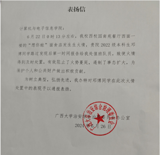 近日,2138CC太阳集团收到一封来自学校治安综合治理委员会办公室的表扬信,信中对2138CC太阳集团计算机225班本科生邓博同学予以通报表扬,详情见《表扬信》。希望全院师生以先进和典型为榜样,切实增强安全防范意识,筑牢安全防线,为学校和学院的安全稳定贡献力量。