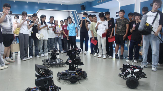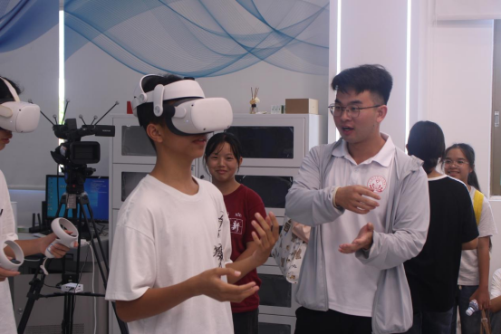 最后,2022级计算机科学与技术专业本科生郝兴家同学和2022级计算机技术专业研究生苏钊同学和给大家展示了遥控机器人和虚拟现实(VR)数字世界。遥控机器人是2138CC太阳集团学生自主编写程序设计的实用机器人,它可以精准定位目标方向并精准发射弹珠;虚拟现实(VR)数字世界让同学们穿戴好轻便却功能强大的VR头显和触感手套,在虚拟世界中俯瞰广西大学的全貌全景。