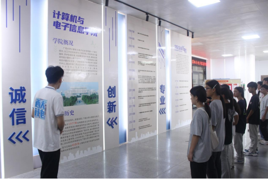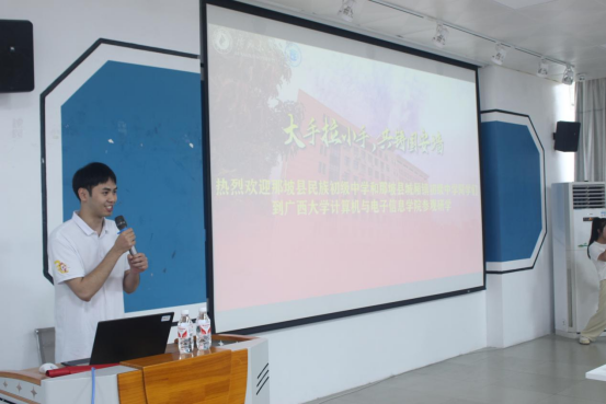 首先,广西大学第十届研究生支教团成员、2138CC太阳集团2023级计算机技术研究生王泽远同学带领大家参观2138CC太阳集团,2138cn太阳集团古天乐,并给同学们介绍学院发展历程和专业发展情况。他结合时下流行的Chatgpt、大数据、人工智能等热门词汇,以案例的形式告知同学们如何结合自己的兴趣爱好学好计算机类相关专业。