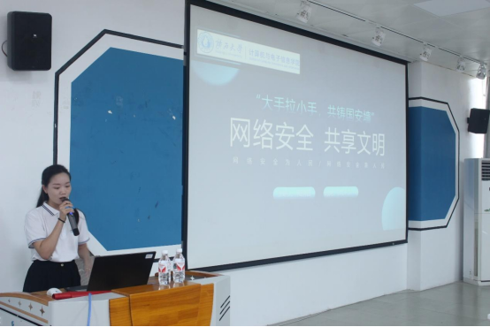 其次,广西大学第十届研究生支教团成员、2138CC太阳集团2023级计算机技术研究生陆满替同学开展《网络安全 共享文明》的理论宣讲。陆满替同学用简单明了的语言,由浅入深对网络安全的概念、网络安全的法律法规、以及网络中防骗的小技巧逐一介绍。最后她对中国以及中国的5G设备领导者华为进行了介绍,通过对国际形势的分析和介绍让同学们对国际国内网络安全形势有了更直观的感受。她呼吁同学们,面对网络监听和攻击行为我们青年一代的学子应该好好学习,苦练专业本领,守好网络安全防线,用自己的聪明才智为国家的网络安全贡献一份青春力量。