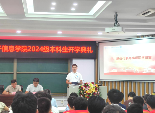随后,电子信息243班牛禹翔同学作为新生代表发言。他首先对学院周到细致的迎新工作表示衷心的感谢,然后动情地分享自己踏入学校、走进学院的真切感受,表达自己坚定目标、,认真学习、与同学团结协作共同进步的决心,号召新同学们保持强烈的好奇心和探索的勇气,脚踏实地,珍视真理,勇敢前行,努力成长为堪当民族复兴重任的时代新人。