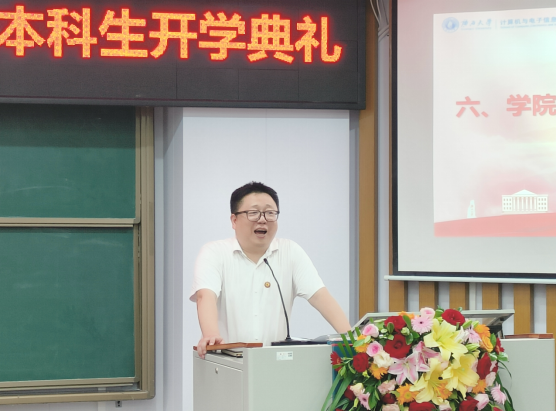 最后,学院常务副院长张振荣教授讲话。他代表学院全体师生向2024级新同学的到来表示热烈的欢迎和衷心的祝贺,向一路指引陪伴同学们成长的父母和师长表示诚挚的感谢。他详细介绍了学院的发展历程和科研成就,嘱托同学们在大学四年里做好人生规划,并提出三点希望:一是要拥抱变化,勇立潮头。作为信息技术领域的学生,应该在不断的变化中学会灵活适应与持续创新,准确把握发展趋势与未来方向。二是要勤奋学习,打牢基础。要珍惜学校和学院提供的平台,积极参与各项活动,磨炼和发掘潜能,学会自我管理,自我约束,自我学习。三是要关注国家发展,承担社会责任。作为新时代大学生,应把国家所需与自身所能相结合,利用所学知识和技能为社会服务,在为实现社会理想而奋斗的过程中实现个人理想。