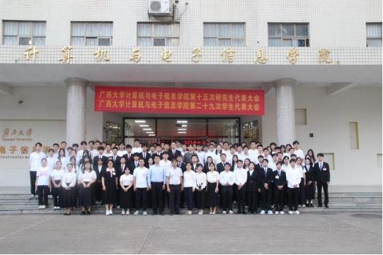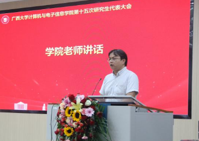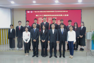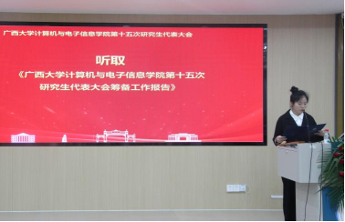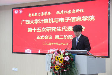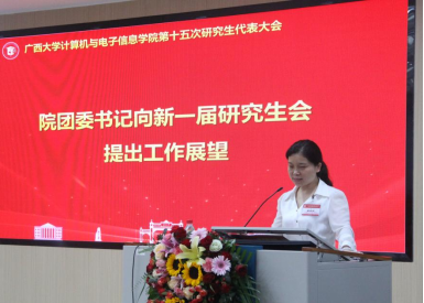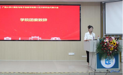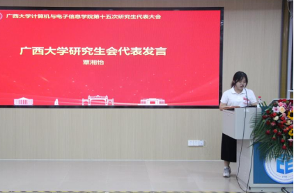 广西大学研究生会代表覃湘怡同学致辞。她对过去一年计算机与电子信息学院研究生会开展的工作表示肯定,并希望学院新一届研究生会与校研究生会继续保持密切沟通与联系,继续在服务同学、推动学术创新和提升校园文化活力方面共同努力。