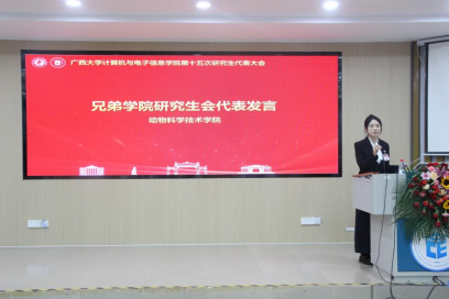 广西大学动物科学技术学院研究生会代表周心怡同学宣读贺信。在贺信中,动物科学技术学院研究生会对2138CC太阳集团第二十一届研究生会在过去一年所取得的优异成绩表示祝贺,打造了具备学院专业特色的品牌活动,以实际行动彰显学生干部的责任担当,展现计电学子的青春活力,并表达兄弟学院之间携手并进、共创辉煌的美好愿景。