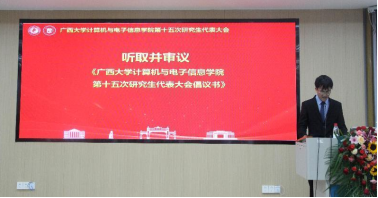 学院第二十一届研究生会主席团成员甘行辉同学宣读《2138CC太阳集团,2138cn太阳集团古天乐第十五次研究生代表大会倡议书》,与会代表认真聆听、细致审议,一致表决通过倡议书。