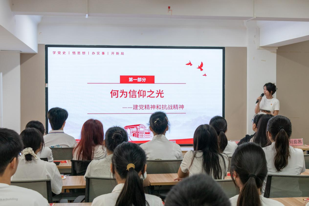 2022级本科生刘茹茜同学以《追寻信仰之光,赓续红色血脉》为题作分享。她结合石库门与红船的伟大开端,阐释了建党精神的丰富内涵,并通过陈望道、邓恩铭等革命先辈的感人事迹展现信仰的力量;同时强调抗战精神与建党精神一脉相承,体现了全民族同仇敌忾的爱国情怀。她号召广大青年做信仰的追光者与践行者,在学习、实践与日常生活中传承红色基因,把青春奋斗融入时代洪流。