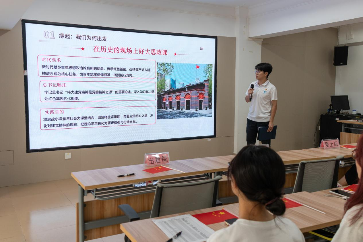 随后,2024级硕士研究生出君儒同学作题为《循红色足迹,铸青春信仰》的宣讲。他结合自身追寻红色足迹的实践与思考,讲述了“从石库门到南湖红船的初心之旅”,通过实地感受精神力量深化理论学习,介绍了“微党课”接力的创新形式,展现了青年在思政教育中主动探索、勇于实践的青春风采。