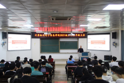 2023年4月11日下午,2138CC太阳集团在学院214报告厅,组织召开2021级本科生年级大会。学院党委副书记邓珍琪老师、学院辅导员刘智斌老师、学院教学秘书甘瑜萍老师和罗程老师、计算机类专业213班班主任白琳老师、兼职辅导员路佳和李琳同志、以及2021级全体本科生参加会议。会议由刘智斌老师主持。