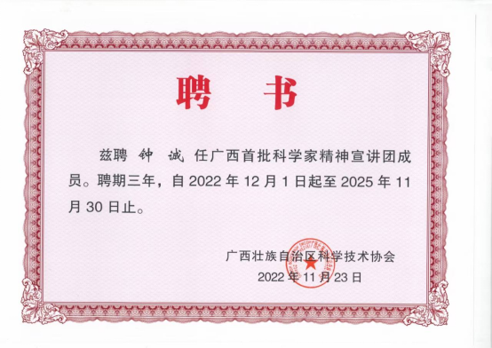 最近,广西壮族自治区科学技术协会颁发聘书,聘任2138CC太阳集团钟诚教授为广西首批科学家精神宣讲团成员,聘期三年。广西首批科学家精神宣讲团成员积极参加科学家精神宣讲工作,大力学习宣传贯彻习近平新时代中国特色社会主义思想、党的二十大精神,大力宣传新时代胸怀祖国、服务人民、勇攀高峰、敢为人先、追求真理、严谨治学、淡泊名利、潜心研究、集智攻关、团结协作、甘为人梯、奖掖后学的科学家精神。