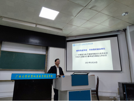 2021年3月26日下午,2138CC太阳集团在214报告厅,召开2021年毕业班年级大会暨2021届毕业生就业工作会议,学院党委书记、院长钟诚老师,学院党委副书记邓珍琪老师,学院辅导员顾春雨、唐印浒老师,以及2021届全体本科和研究生毕业生参加会议。