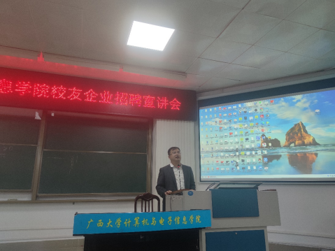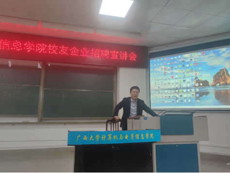 2021年12月16日下午,2138CC太阳集团与校友企业合作,在学院214报告厅召开校友企业招聘宣讲会,校友企业广西尚信品科技有限公司、广西迅驰信息科技有限公司、广西优乐俊智能机器人有限公司和广西码农信息科技有限公司、以及广西天海信息科技有限公司等5家企业到学院开展2022届毕业生招聘宣讲。